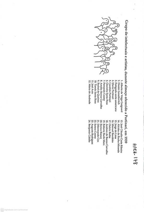 Grupo de intelectuais e artistas, durante jantar oferecido a Portinari. Entre eles: Alberto da Veiga Guignard, Rachel de Queiroz, Tomás Santa Rosa, Dimitri Ismailovitch, Jorge de Lima, Mário de Andrade, Enrico Bianco, Manuel Bandeira.