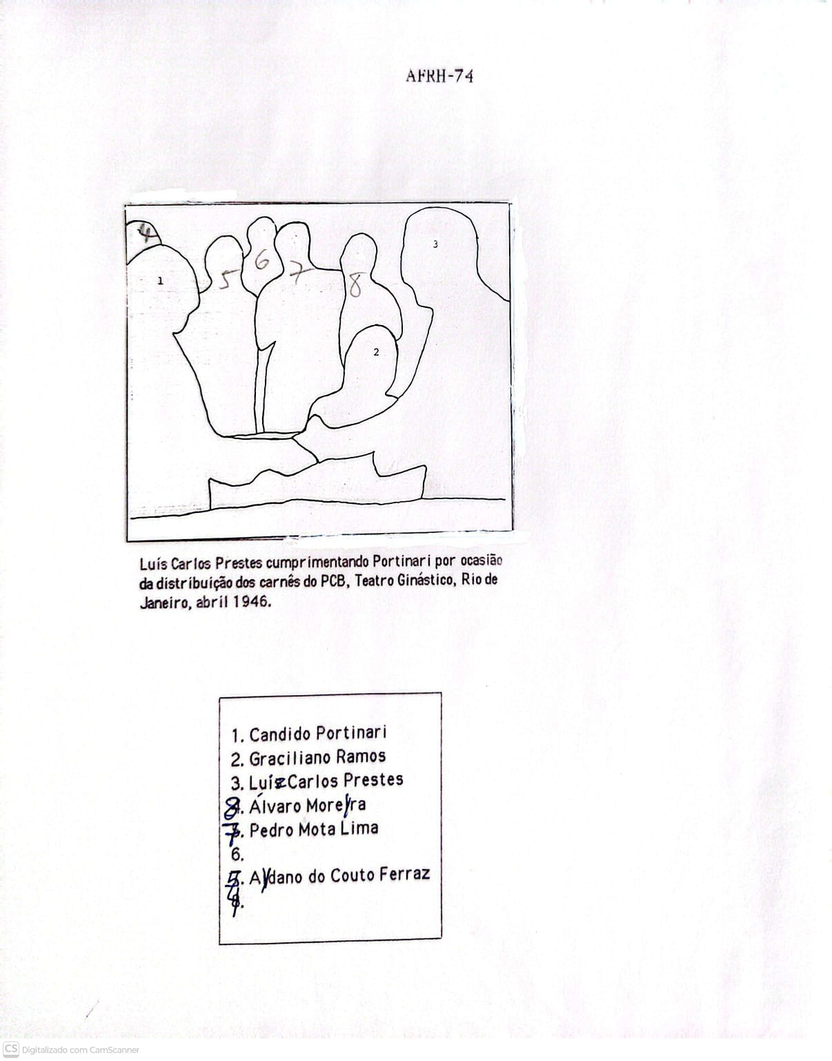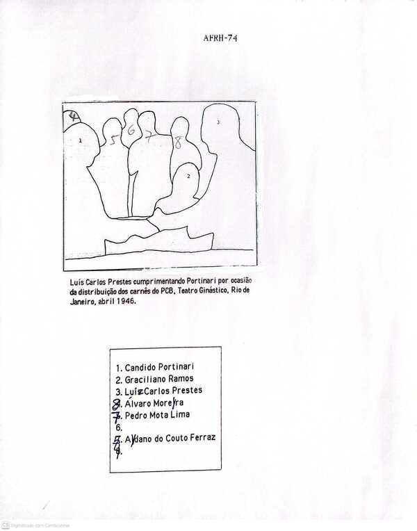 Portinari recebendo de Luiz Carlos Prestes o carnê de membro do Partido Comunista, no Teatro Ginástico.