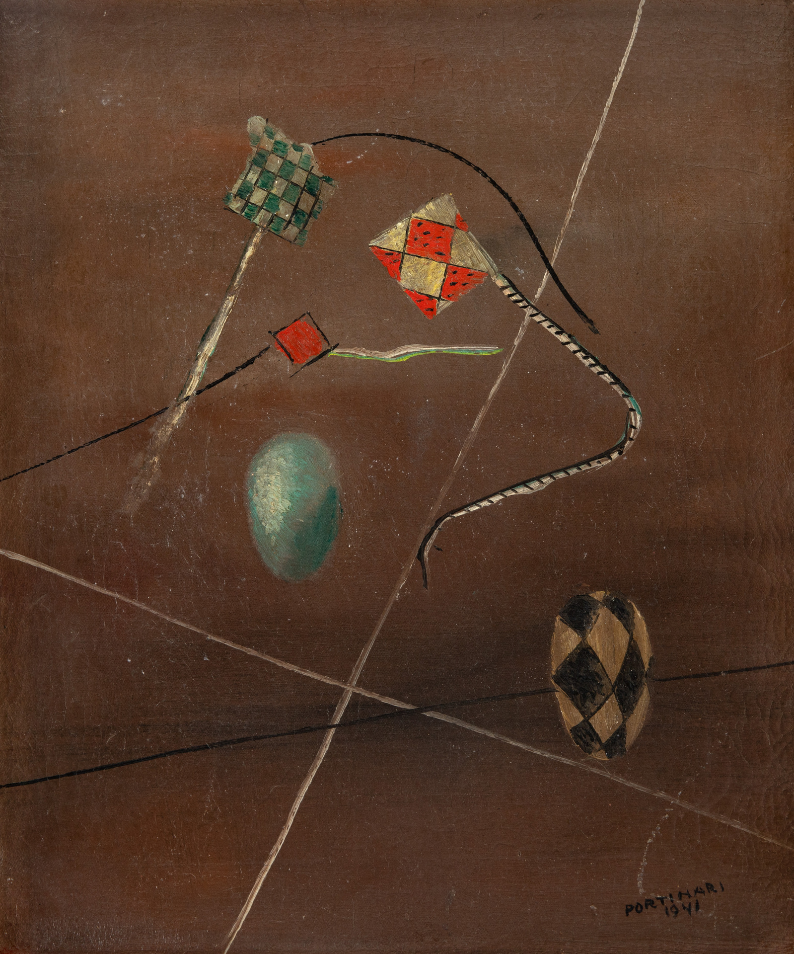 Composition in blue, white, red and black. Smooth texture. Representation sky with moon, stars and balloons. All sky blue, with white moon in the upper on the right half; three balloons side by side and decreasing sizes from the left to the right, in the center; three rabiolas in red with stars on the tips to the left, center and on the right; and several scattered white stars. Two black lines cut composition, intersecting in the upper on the right half: a slightly diagonal from the left to the right and from top to bottom and the other beneath diagonally up and from the left to the right.